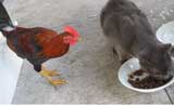 مقطع ديك مشاكس يحاول سرقة الأكل من القطة